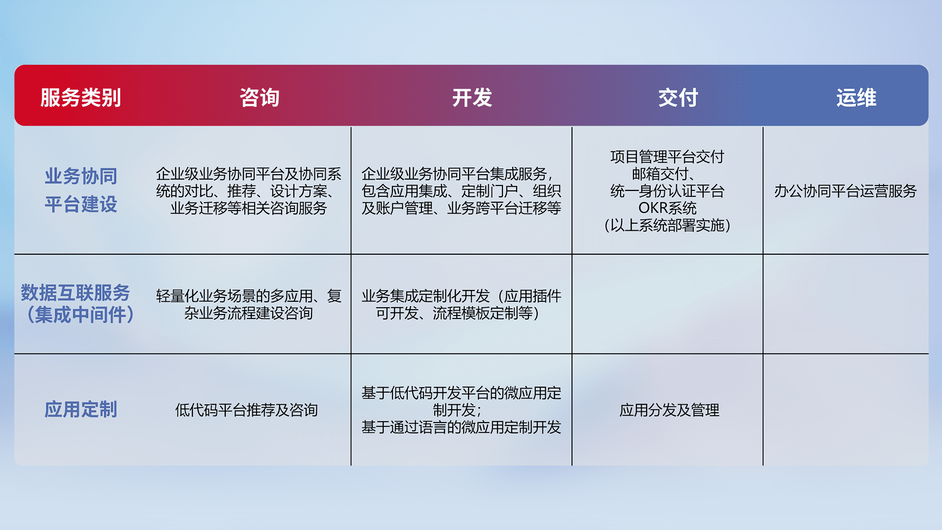 针对钉钉、、、、企微、、、IDaas等平台级产品提供产品的规划、、、方案、、、交付、、定制化开发等服务,,,,实现如统一协同办公、、智能客户服务、、、混合会议管理、、、智能数据查询、、、、等业务场景,,,,实现数字化转型。。。。