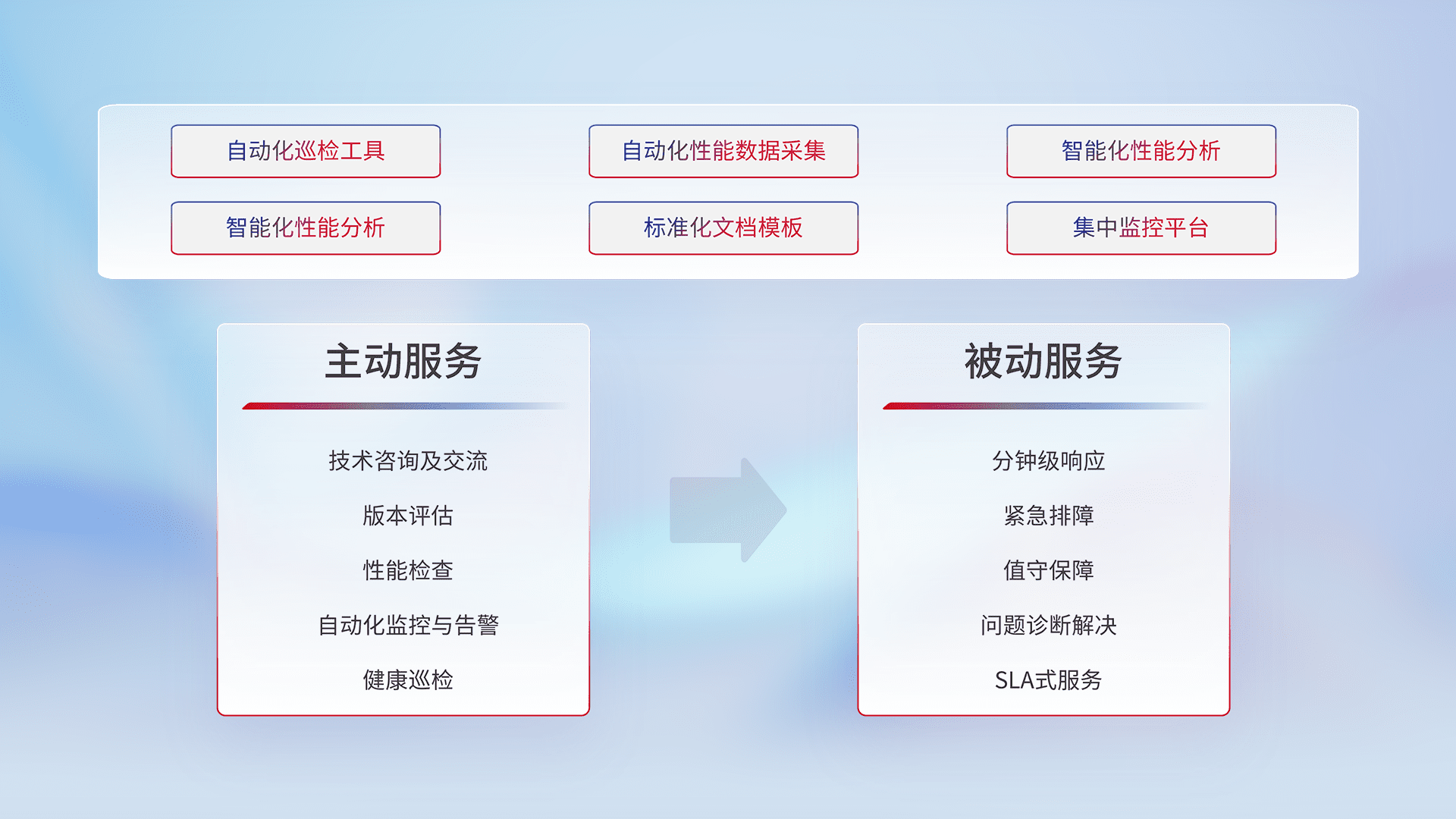 智能化工具和标准化文档,,,,保障服务质量,,,,提供主动服务(包含技术咨询、、版本评估、、性能检查、、、自动化监控与告警、、健康巡检)和被动服务包含(分钟级响应、、、、紧急排障、、、、值守保障、、、问题诊断解决、、SLA服务)。。。